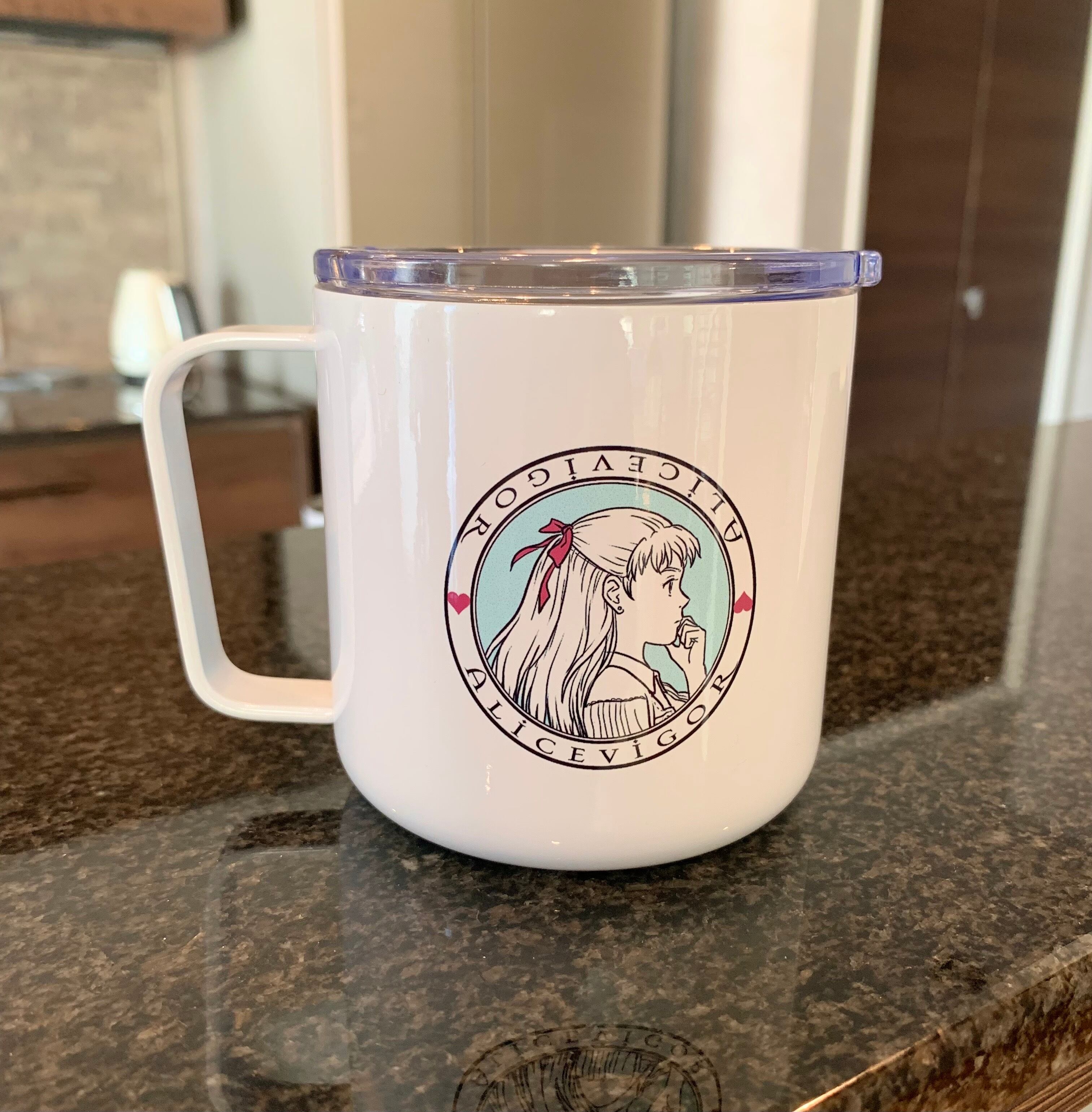Alicevigorのロゴマークを配した、シンプルで飽きの来ない、スタイリッシュなデザインの蓋付きマグカップです。
