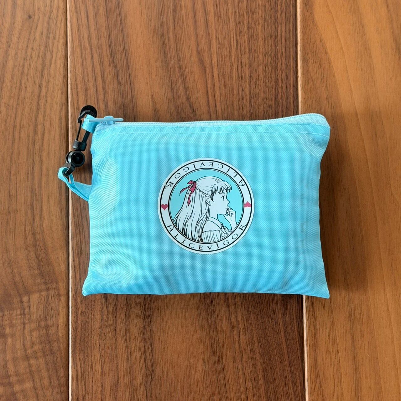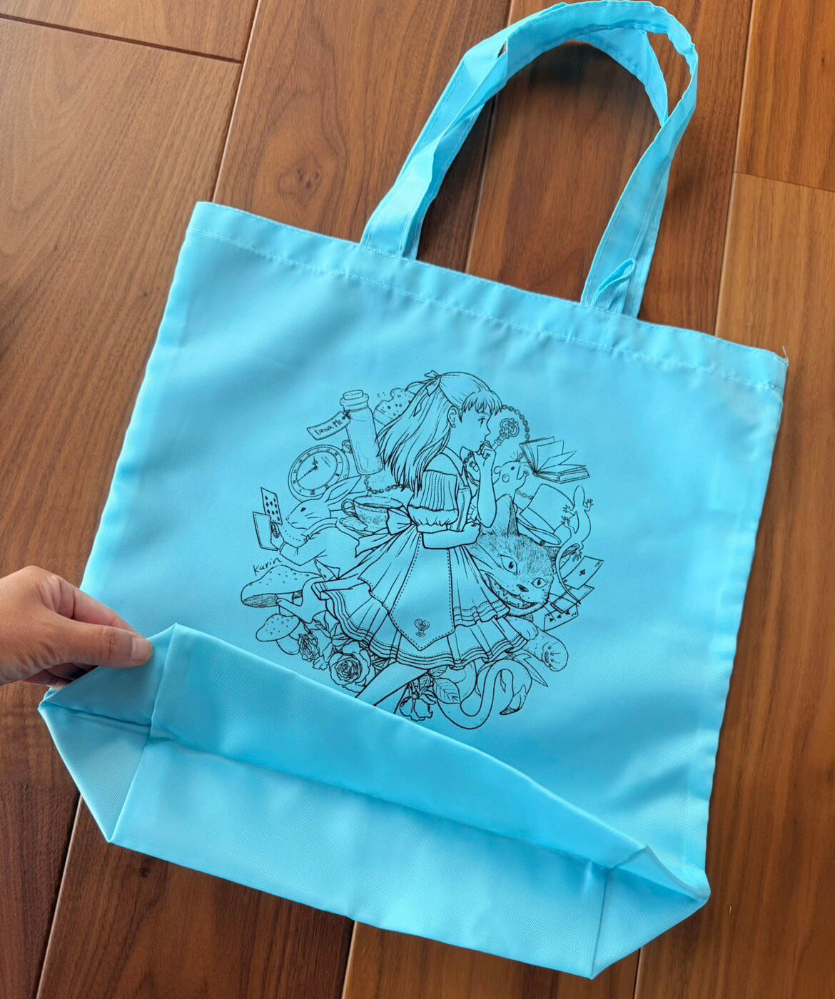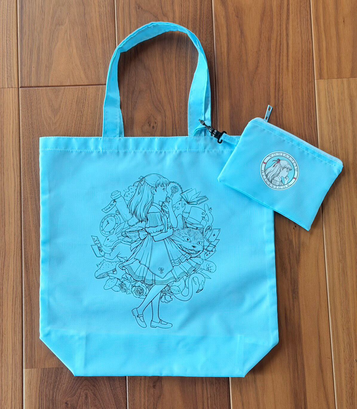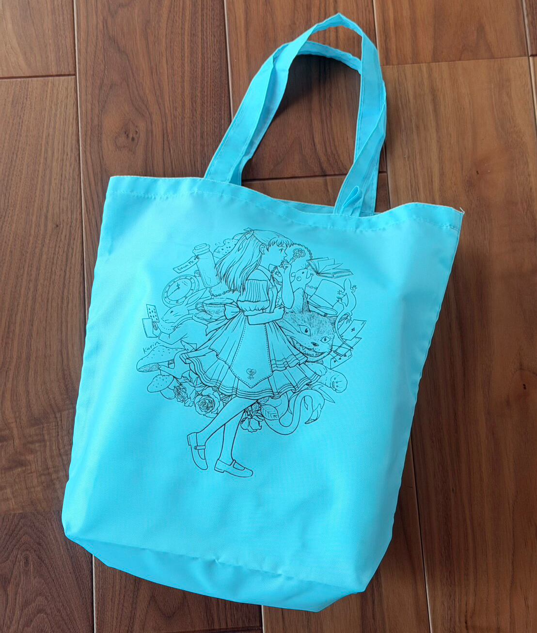 おしゃれで機能的、アリスのイラストのマイバッグです。くっきりライトブルーの色合いが、カバンの中で見つけやすいです。